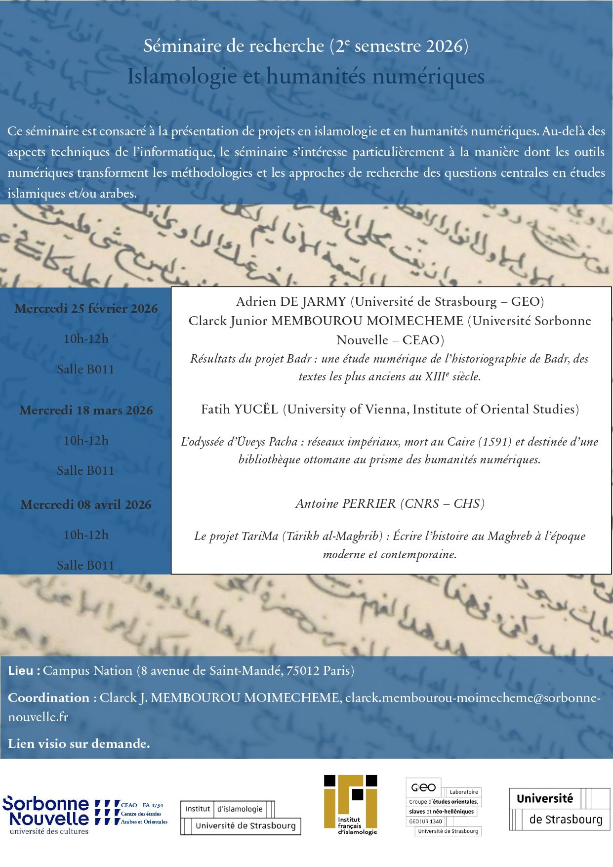 La deuxième saison du séminaire « Islamologie et humanités numériques » débutera le mercredi 25 février 2026 à 10h, dans le cadre d’un partenariat entre l’Université de Strasbourg et l’Université Sorbonne Nouvelle.